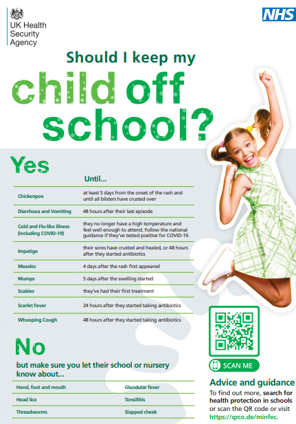 As a school we follow the GOV.UK guidence on the management of infectious diseases: Infectious diseases: education and childcare settings - GOV.UK